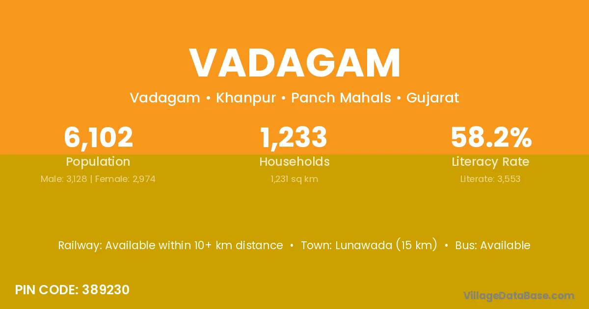 Lunawada (15 km) is the nearest town to Vadagam village for major economic activities and is located approximately 15 km away.