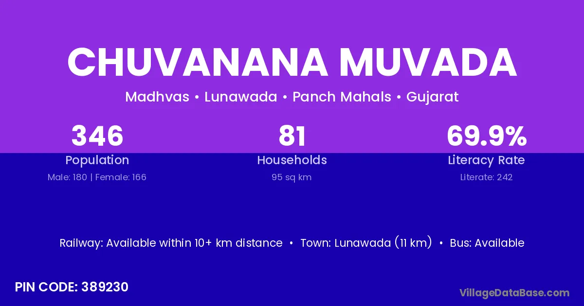 Lunawada (11 km) is the nearest town to Chuvanana Muvada village for major economic activities and is located approximately 11 km away.