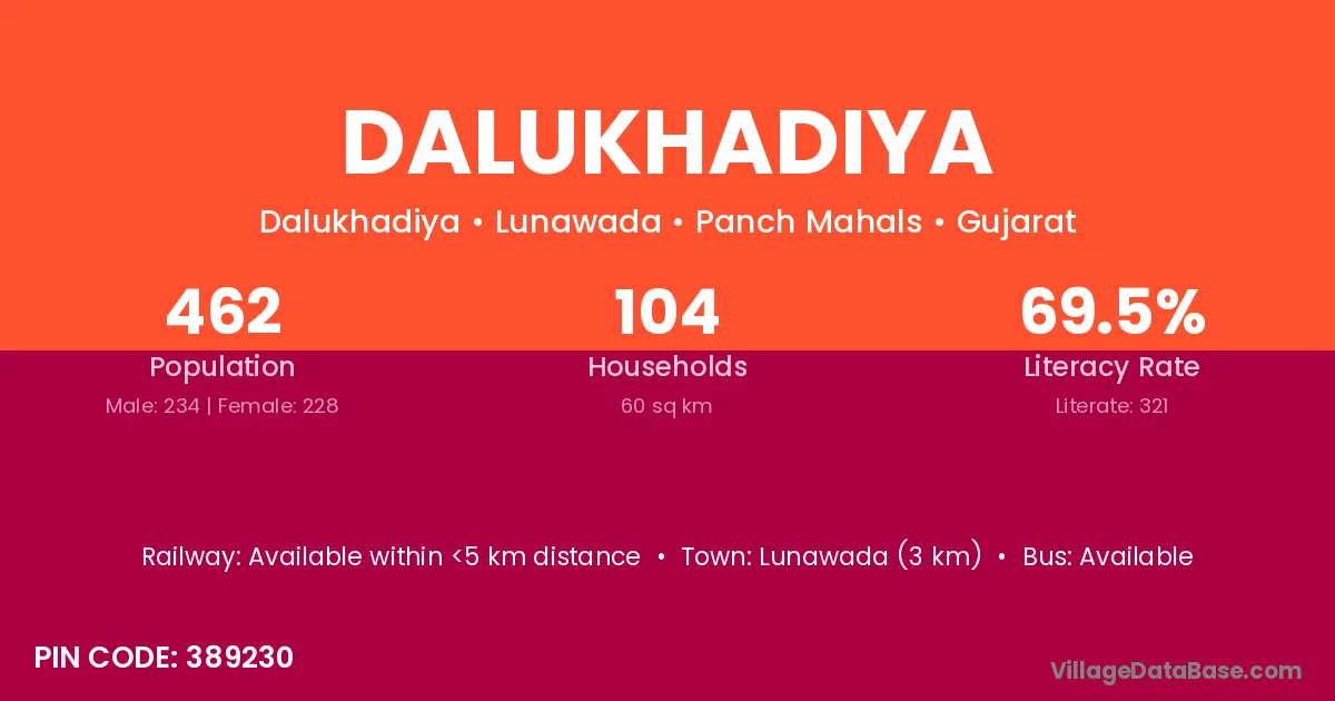Dalukhadiya village has a total population of 462 people, of which 234 are males and 228 are females.
