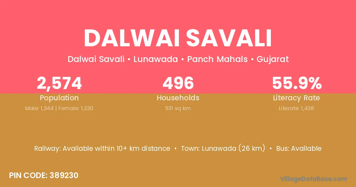 Lunawada (26 km) is the nearest town to Dalwai Savali village for major economic activities and is located approximately 26 km away.