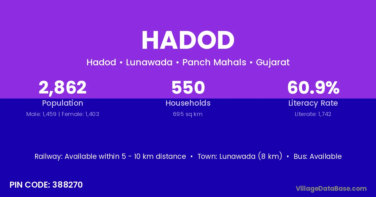Lunawada (8 km) is the nearest town to Hadod village for major economic activities and is located approximately 8 km away.