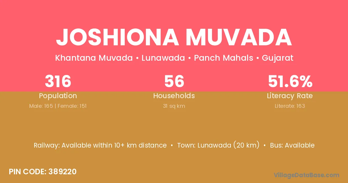 Joshiona Muvada village has a total population of 316 people, of which 165 are males and 151 are females.