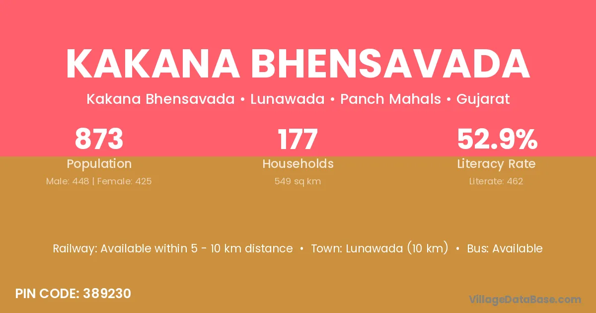 Kakana Bhensavada village has a total population of 873 people, of which 448 are males and 425 are females.