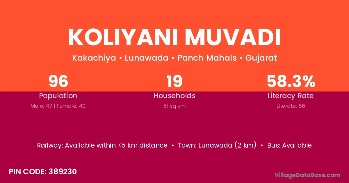 Lunawada (2 km) is the nearest town to Koliyani Muvadi village for major economic activities and is located approximately 2 km away.