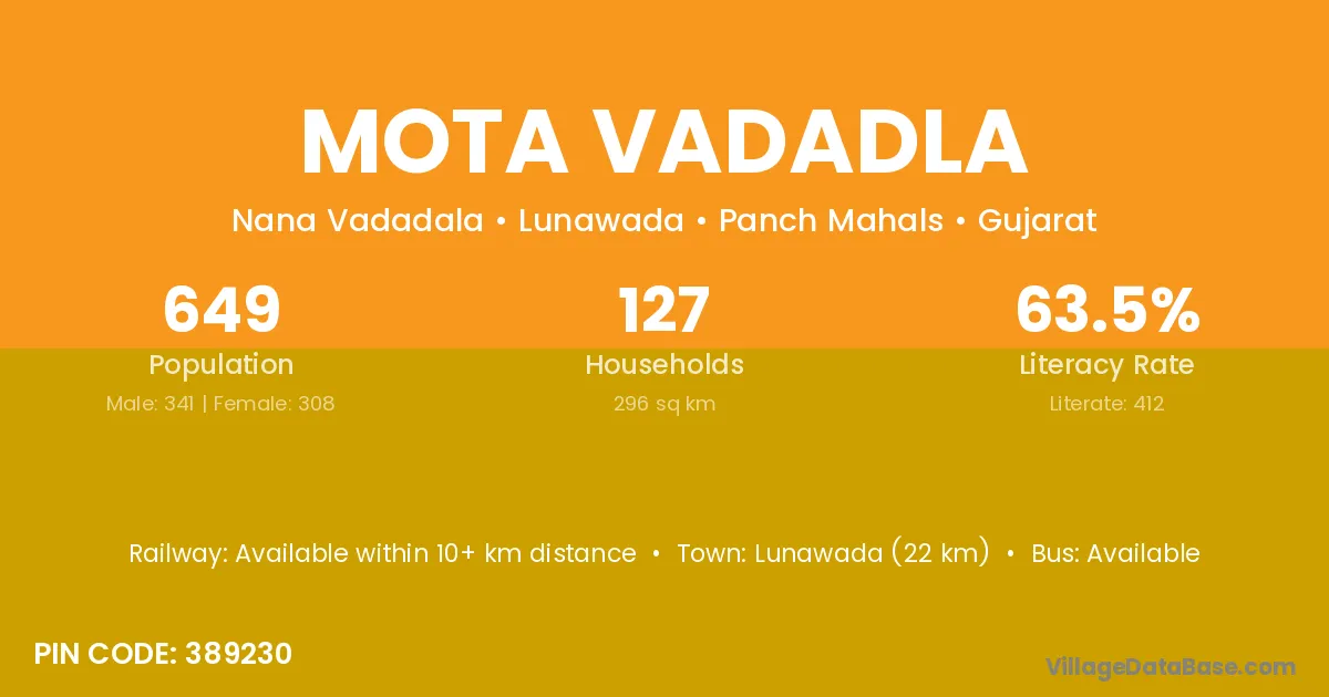 Mota Vadadla village has a total population of 649 people, of which 341 are males and 308 are females.