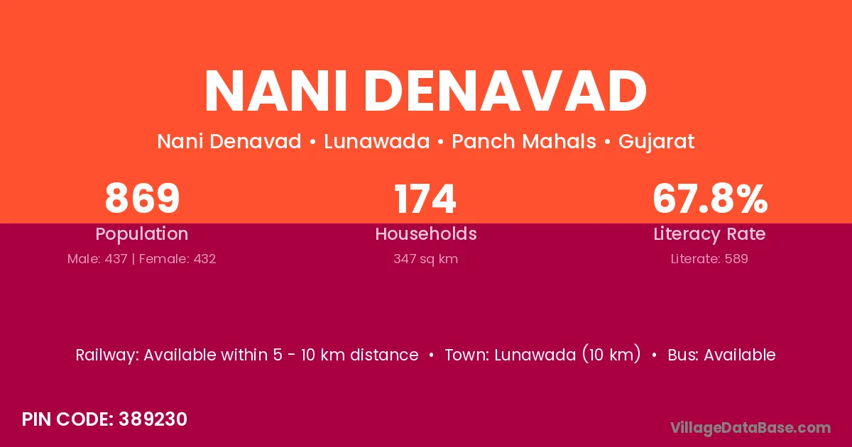 According to Census 2011 information, the village code of Nani Denavad village is 389230.