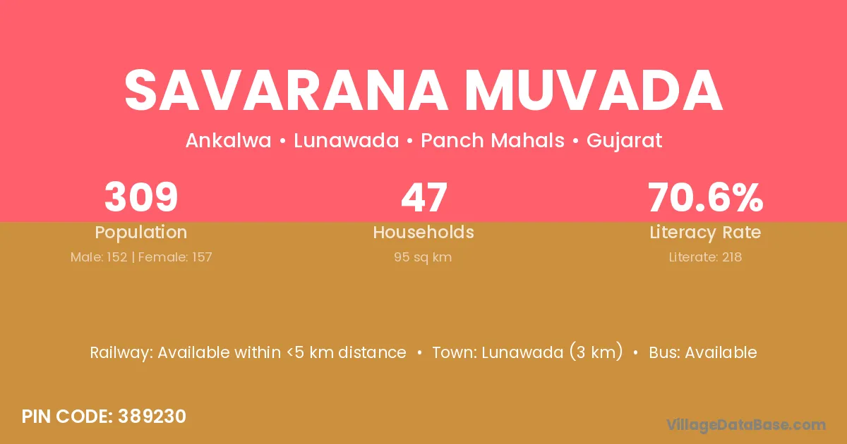Lunawada (3 km) is the nearest town to Savarana Muvada village for major economic activities and is located approximately 3 km away.
