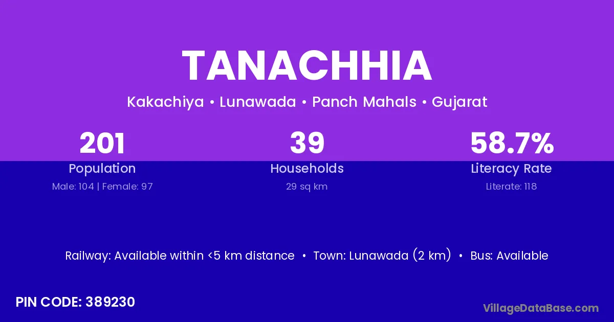 Lunawada (2 km) is the nearest town to Tanachhia village for major economic activities and is located approximately 2 km away.