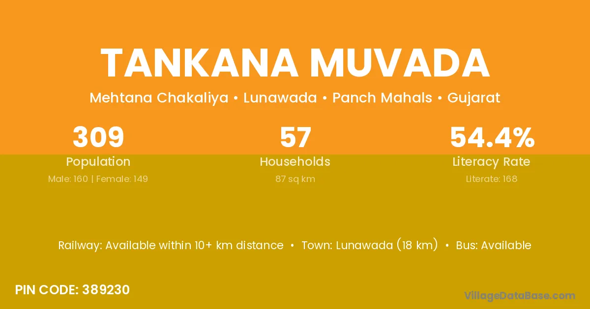 Lunawada (18 km) is the nearest town to Tankana Muvada village for major economic activities and is located approximately 18 km away.
