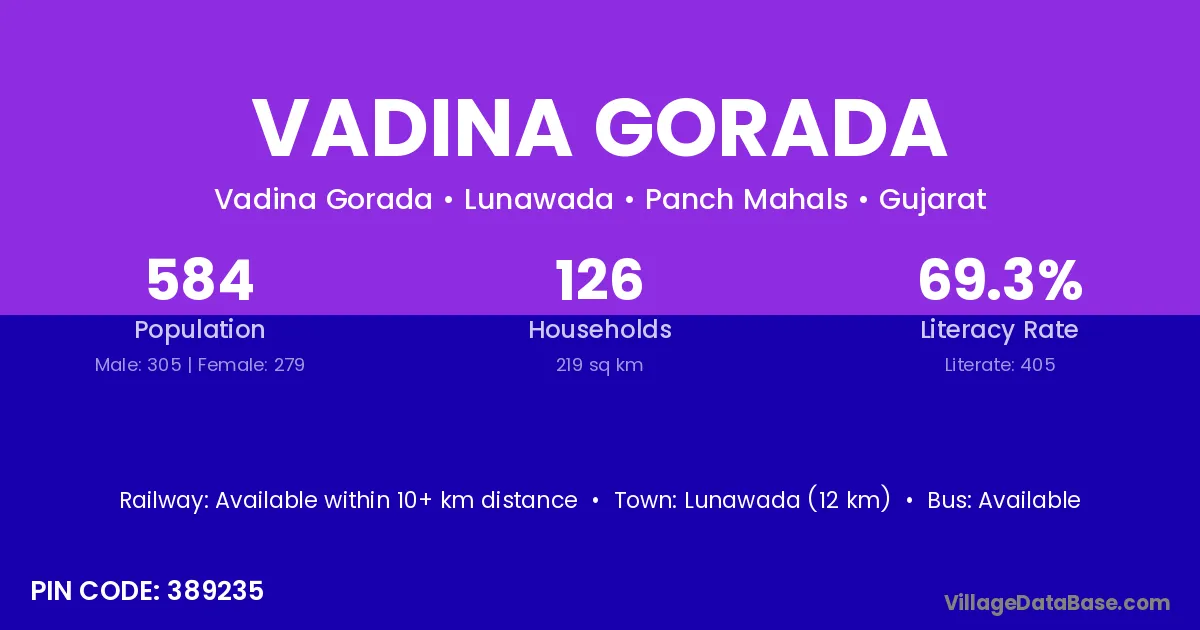 Lunawada (12 km) is the nearest town to Vadina Gorada village for major economic activities and is located approximately 12 km away.
