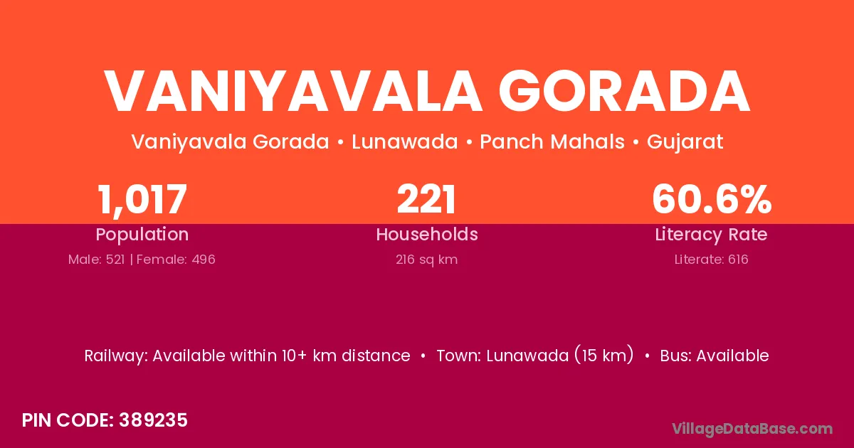 Lunawada (15 km) is the nearest town to Vaniyavala Gorada village for major economic activities and is located approximately 15 km away.