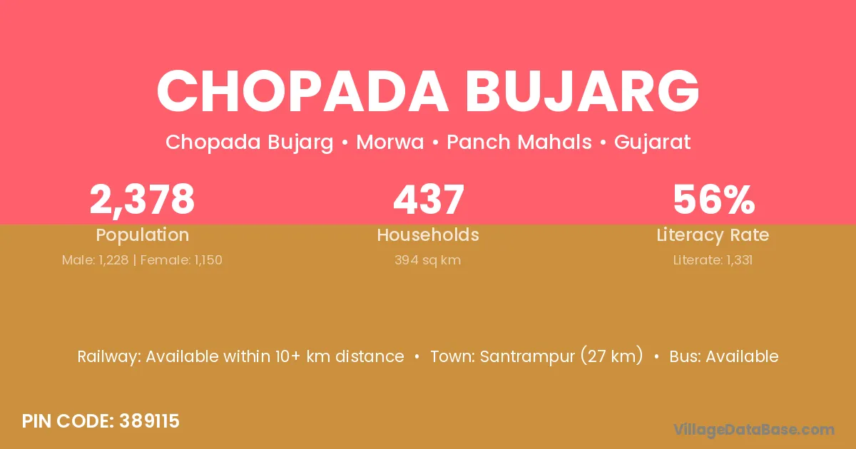 Santrampur (27 km) is the nearest town to Chopada Bujarg village for major economic activities and is located approximately 27 km away.