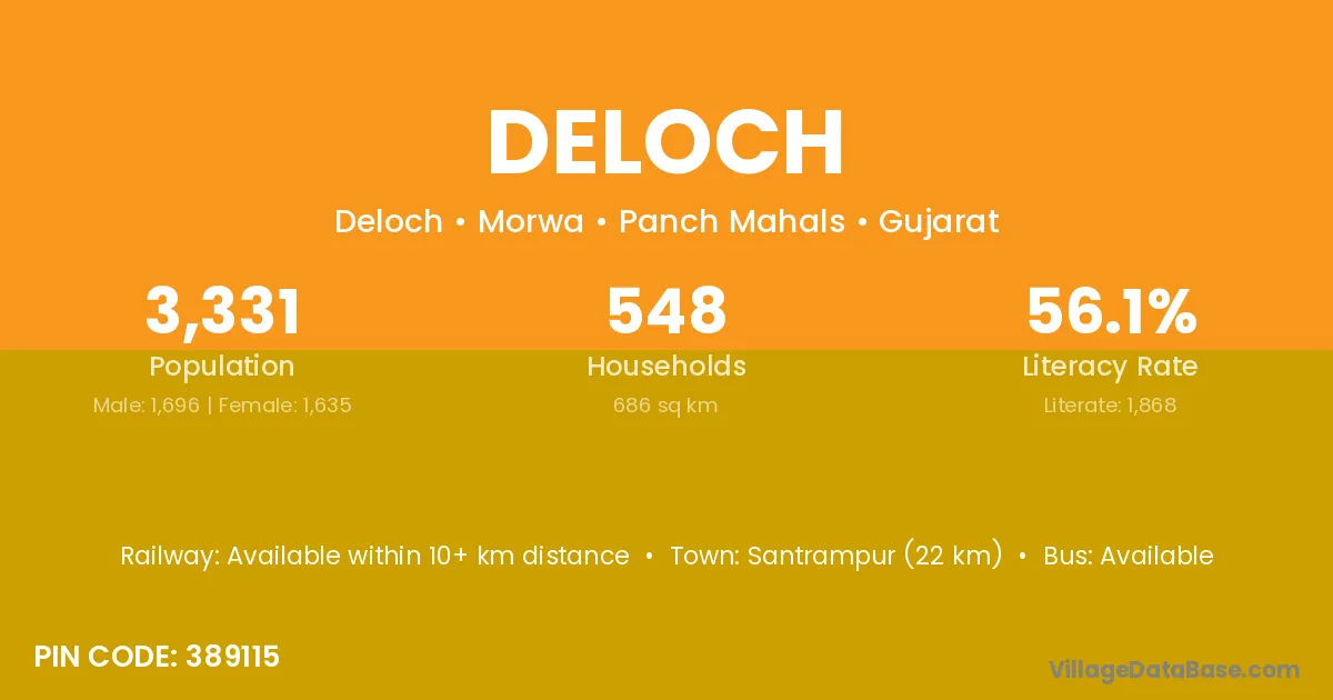 Santrampur (22 km) is the nearest town to Deloch village for major economic activities and is located approximately 22 km away.