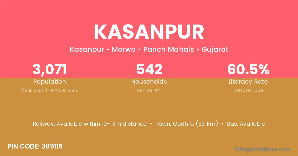 Godhra (33 km) is the nearest town to Kasanpur village for major economic activities and is located approximately 33 km away.