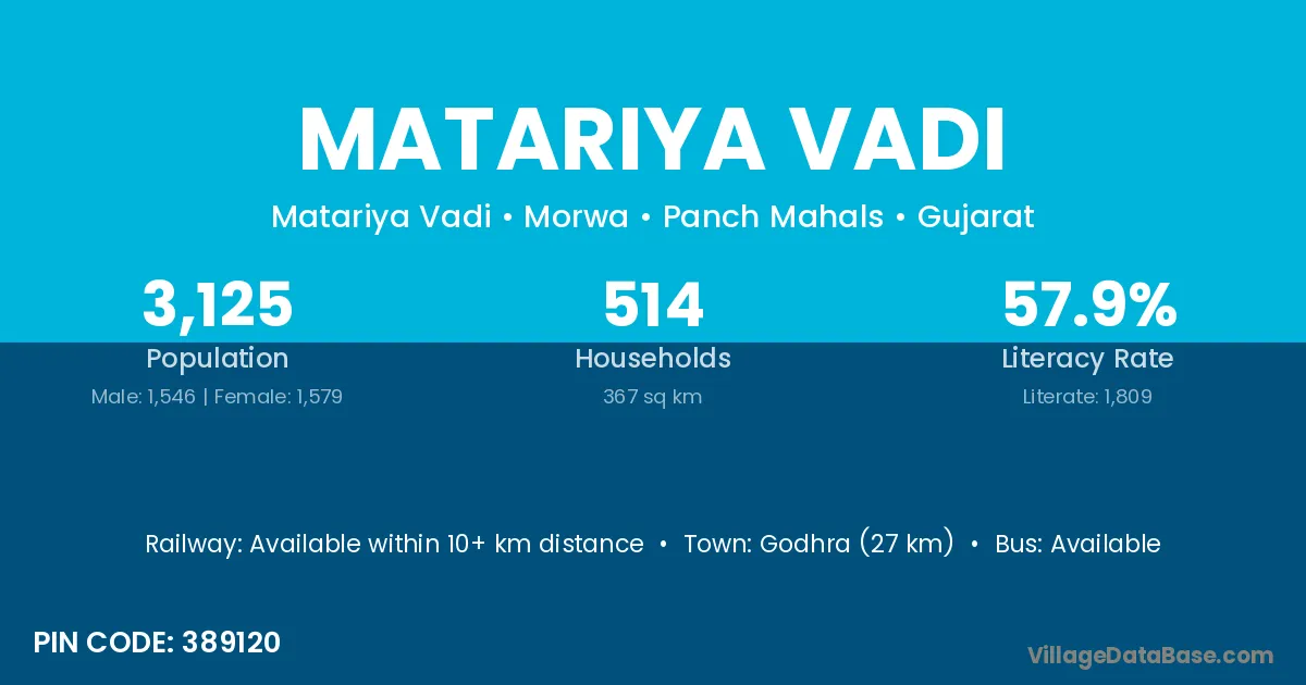 Godhra (27 km) is the nearest town to Matariya Vadi village for major economic activities and is located approximately 27 km away.