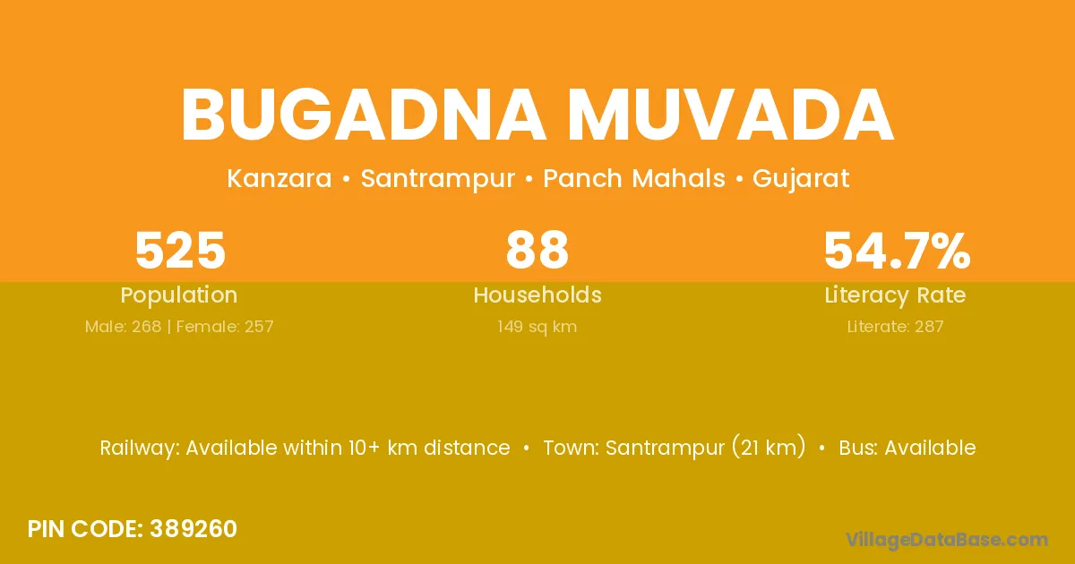 Bugadna Muvada village has a total population of 525 people, of which 268 are males and 257 are females.