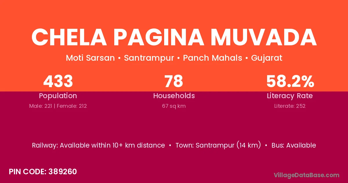 Santrampur (14 km) is the nearest town to Chela Pagina Muvada village for major economic activities and is located approximately 14 km away.