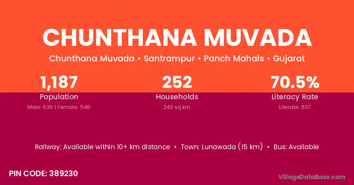 Lunawada (15 km) is the nearest town to Chunthana Muvada village for major economic activities and is located approximately 15 km away.