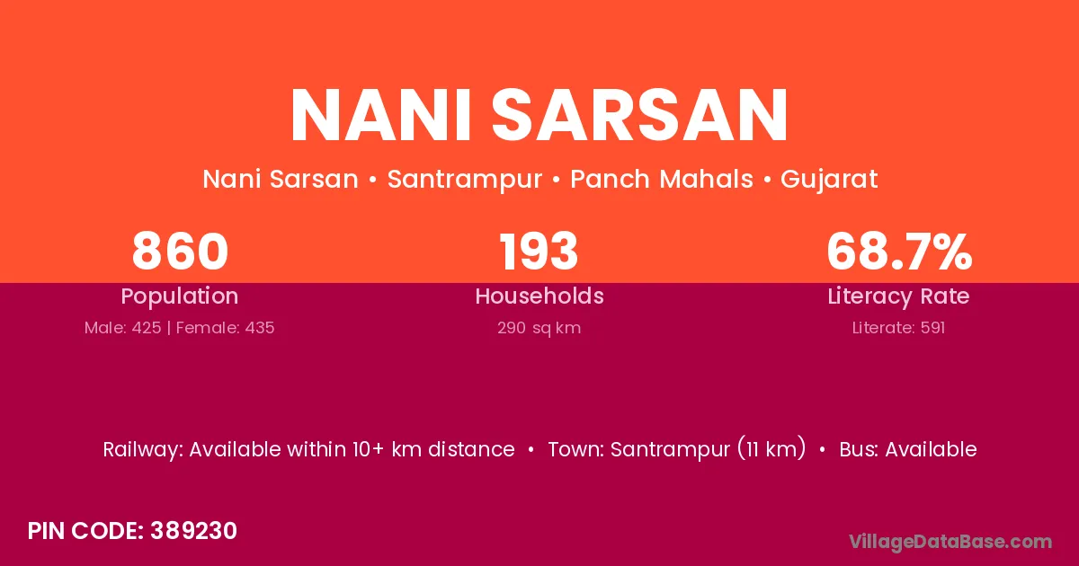 Santrampur (11 km) is the nearest town to Nani Sarsan village for major economic activities and is located approximately 11 km away.