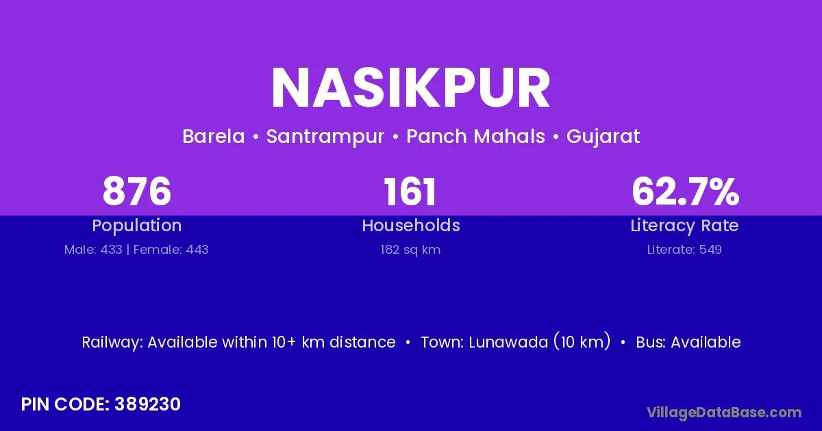 Lunawada (10 km) is the nearest town to Nasikpur village for major economic activities and is located approximately 10 km away.