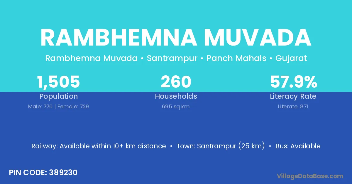 Santrampur (25 km) is the nearest town to Rambhemna Muvada village for major economic activities and is located approximately 25 km away.