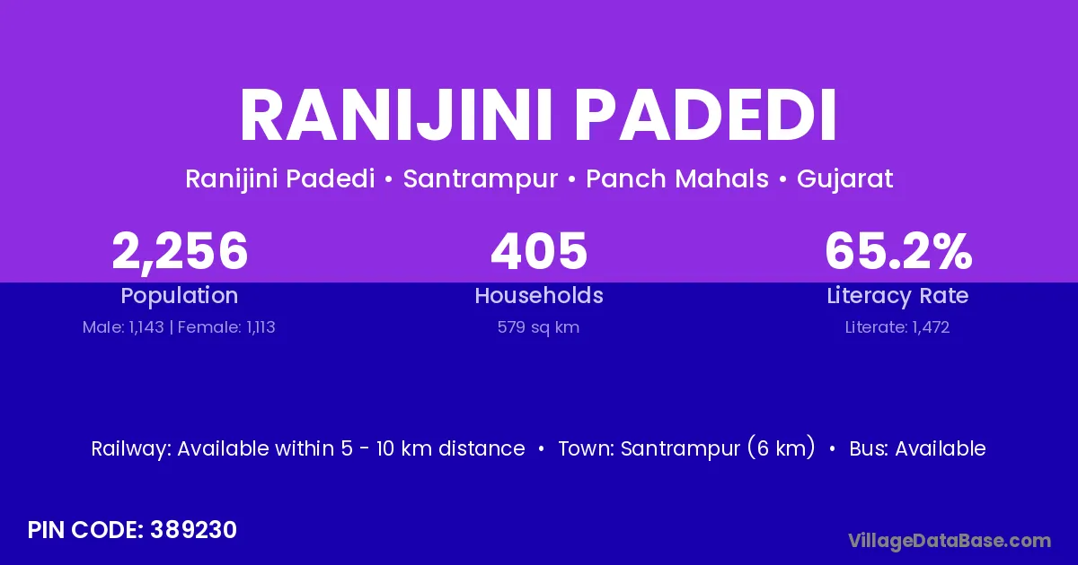 Santrampur (6 km) is the nearest town to Ranijini Padedi village for major economic activities and is located approximately 6 km away.