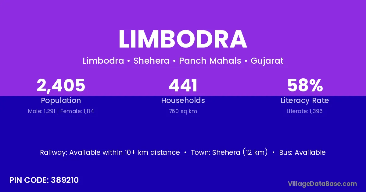 Shehera (12 km) is the nearest town to Limbodra village for major economic activities and is located approximately 12 km away.