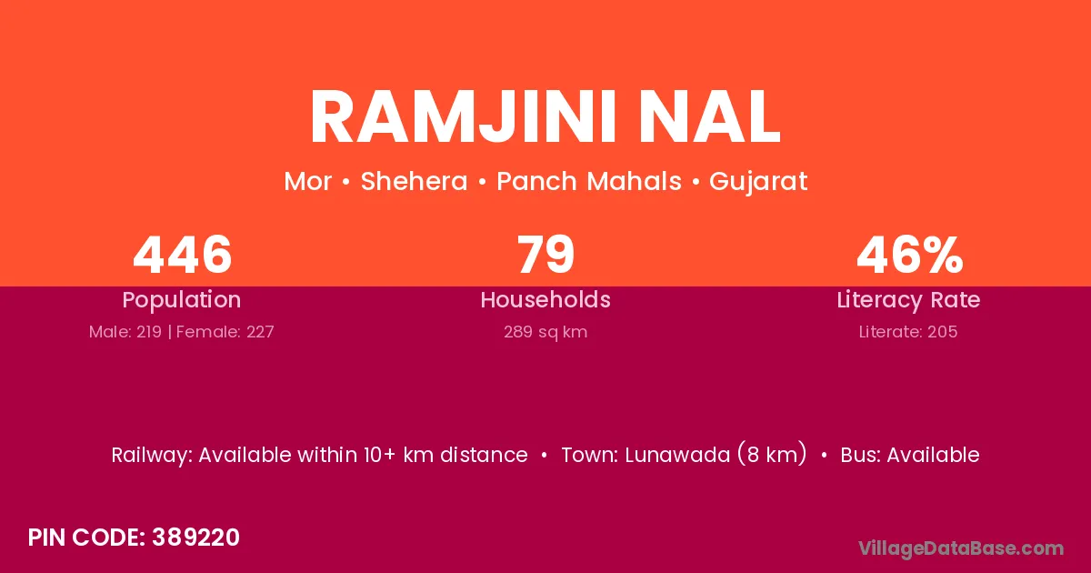 Lunawada (8 km) is the nearest town to Ramjini Nal village for major economic activities and is located approximately 8 km away.