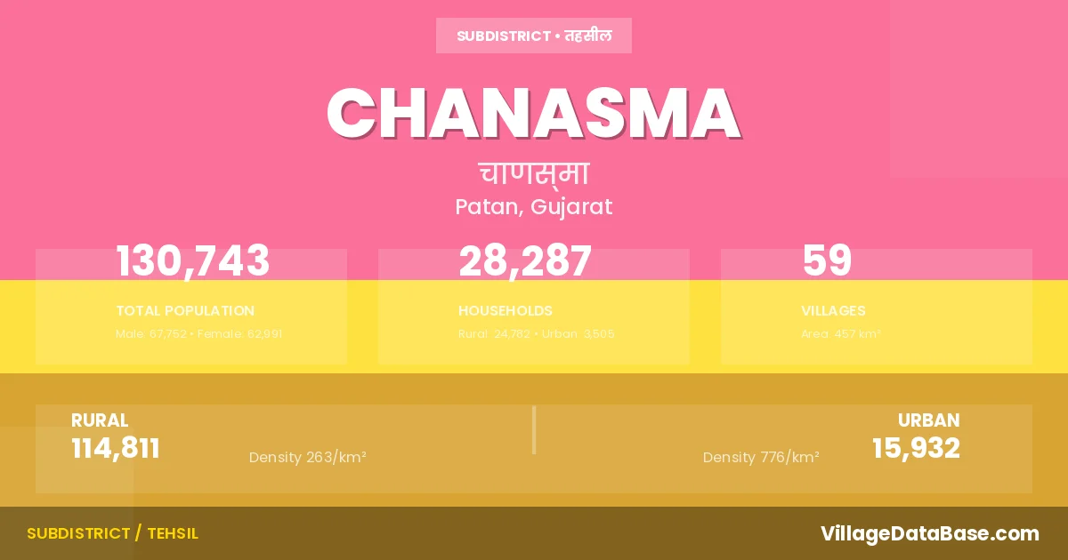 According to the 2011 census The total area of Chanasma Taluka is 457 km², with a population of 130743 people. The population density is 286 inhabitants per square kilometre, and there are approximately 28287 houses in the sub district.