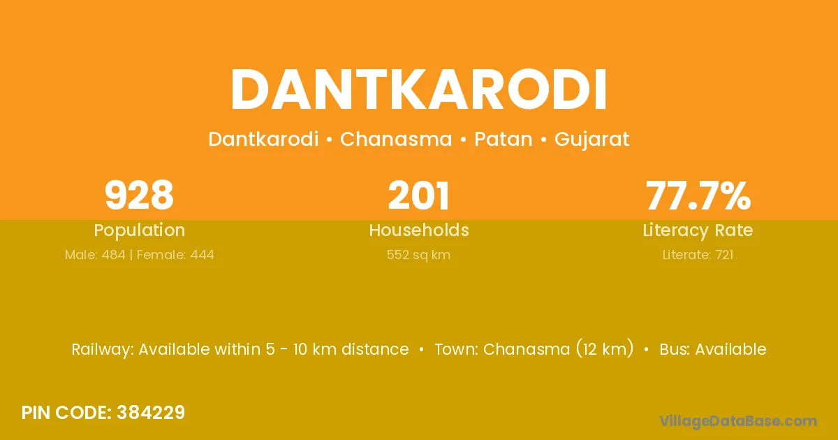 Chanasma (12 km) is the nearest town to Dantkarodi village for major economic activities and is located approximately 12 km away.