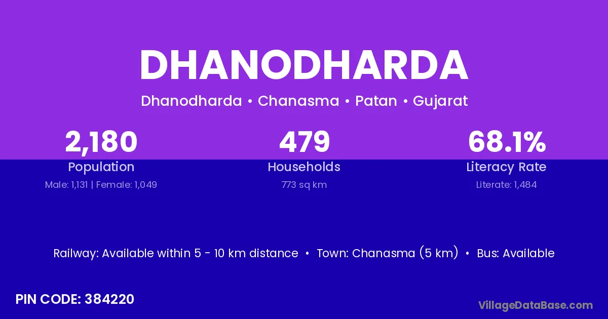 Chanasma (5 km) is the nearest town to Dhanodharda village for major economic activities and is located approximately 5 km away.