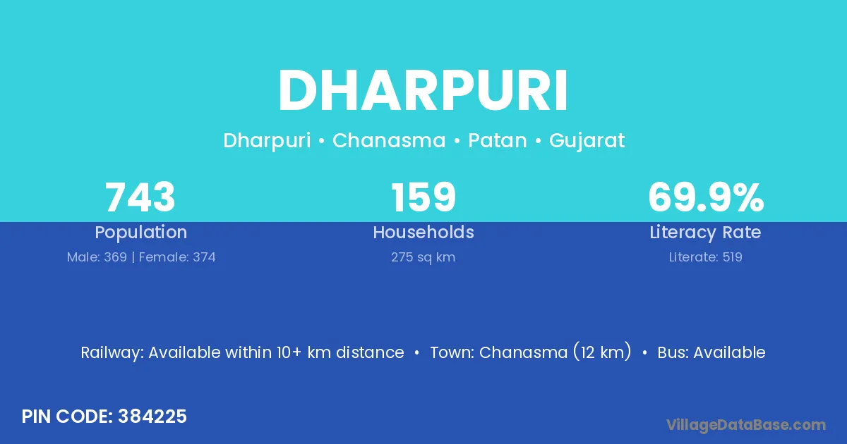 Chanasma (12 km) is the nearest town to Dharpuri village for major economic activities and is located approximately 12 km away.