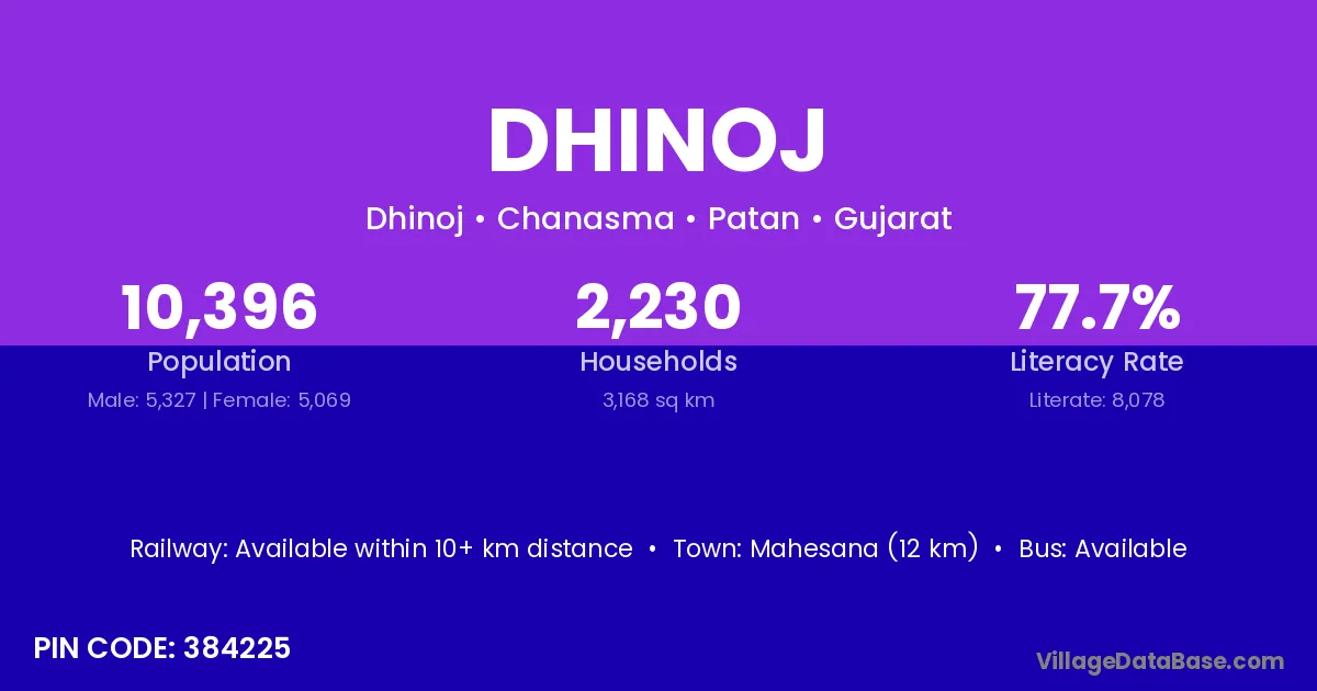 Mahesana (12 km) is the nearest town to Dhinoj village for major economic activities and is located approximately 12 km away.