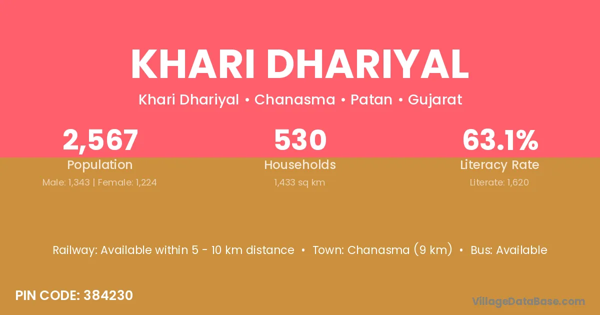 Chanasma (9 km) is the nearest town to Khari Dhariyal village for major economic activities and is located approximately 9 km away.