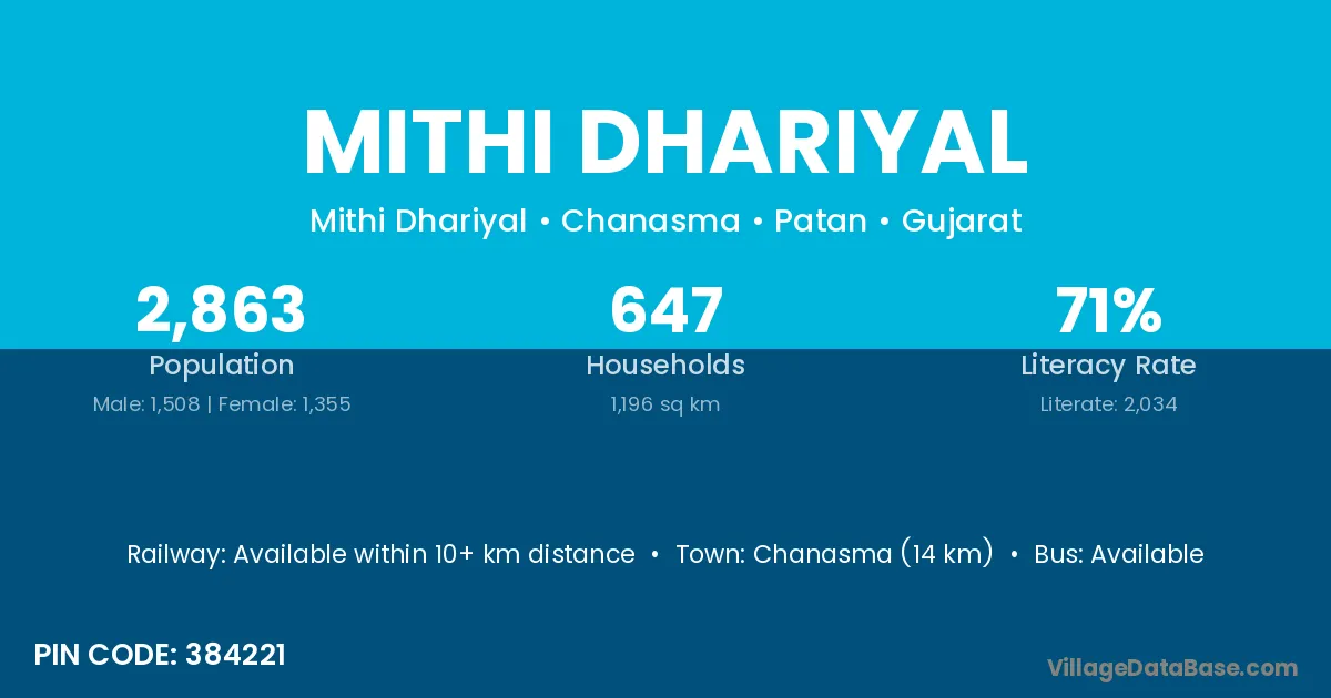 Chanasma (14 km) is the nearest town to Mithi Dhariyal village for major economic activities and is located approximately 14 km away.