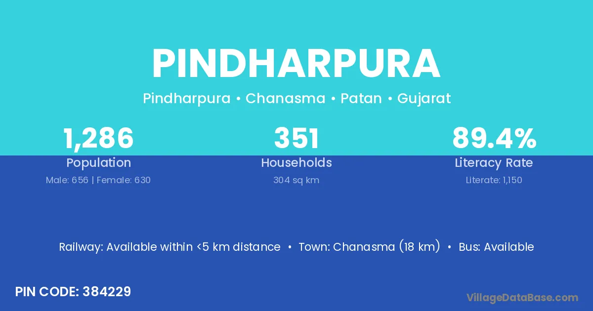 Chanasma (18 km) is the nearest town to Pindharpura village for major economic activities and is located approximately 18 km away.