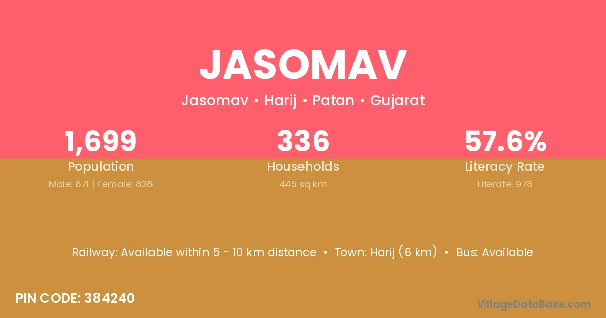 Harij (6 km) is the nearest town to Jasomav village for major economic activities and is located approximately 6 km away.