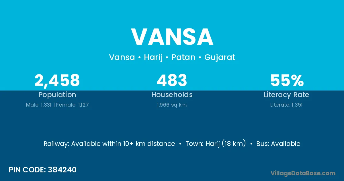 Harij (18 km) is the nearest town to Vansa village for major economic activities and is located approximately 18 km away.