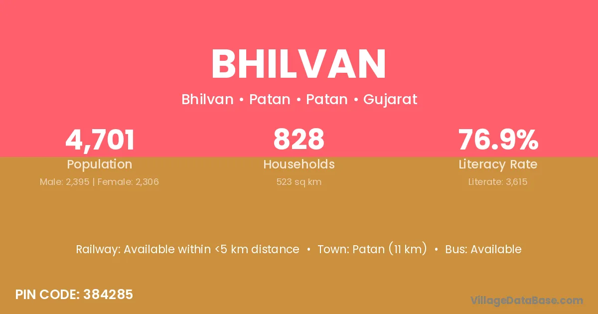 Patan (11 km) is the nearest town to Bhilvan village for major economic activities and is located approximately 11 km away.