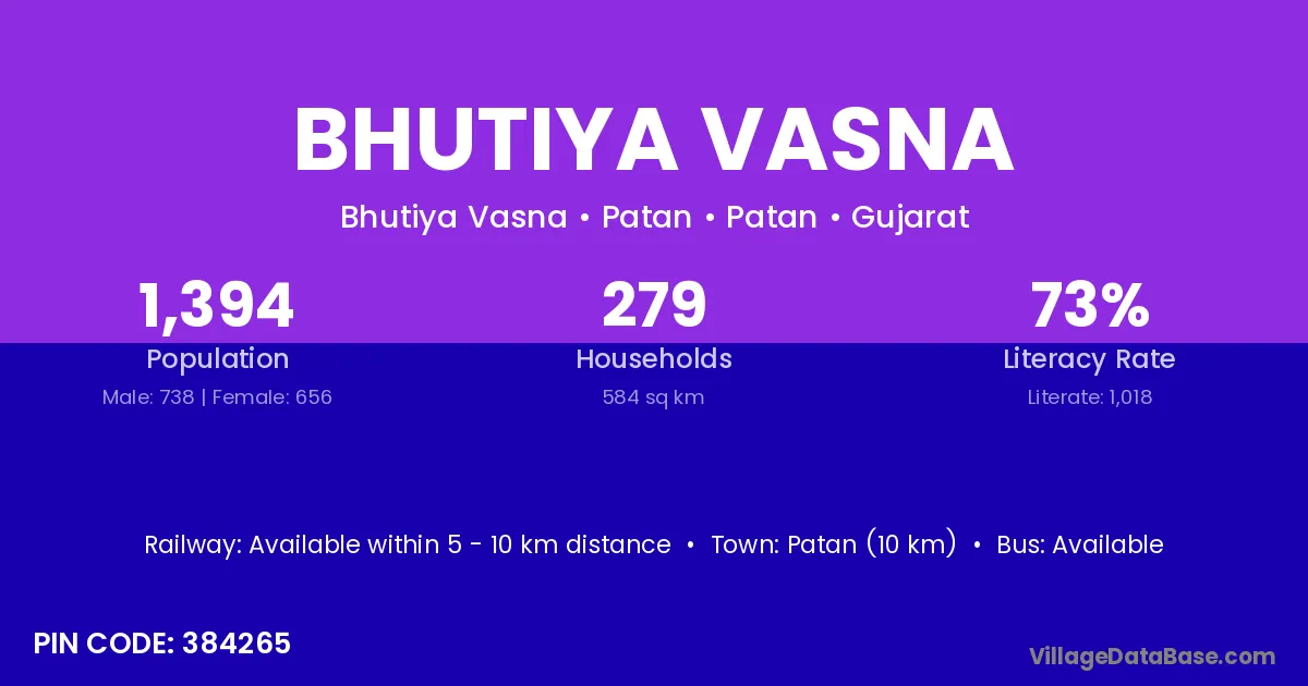 Patan (10 km) is the nearest town to Bhutiya Vasna village for major economic activities and is located approximately 10 km away.