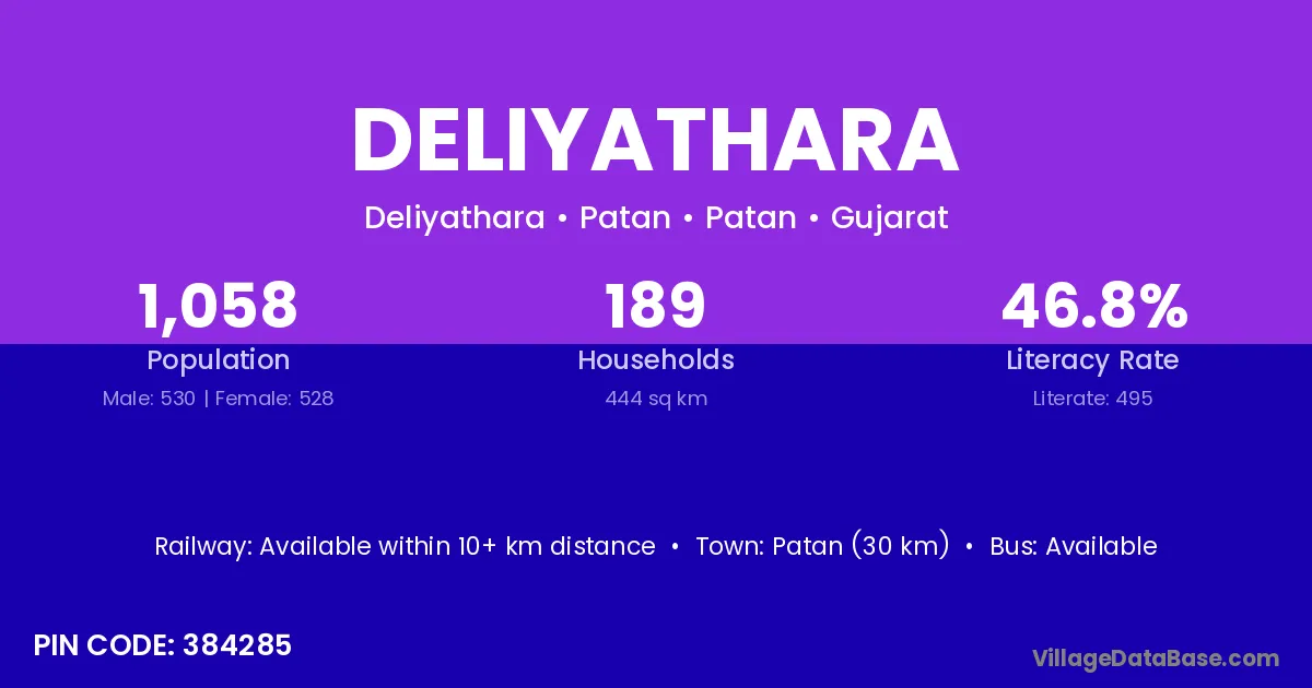 Patan (30 km) is the nearest town to Deliyathara village for major economic activities and is located approximately 30 km away.