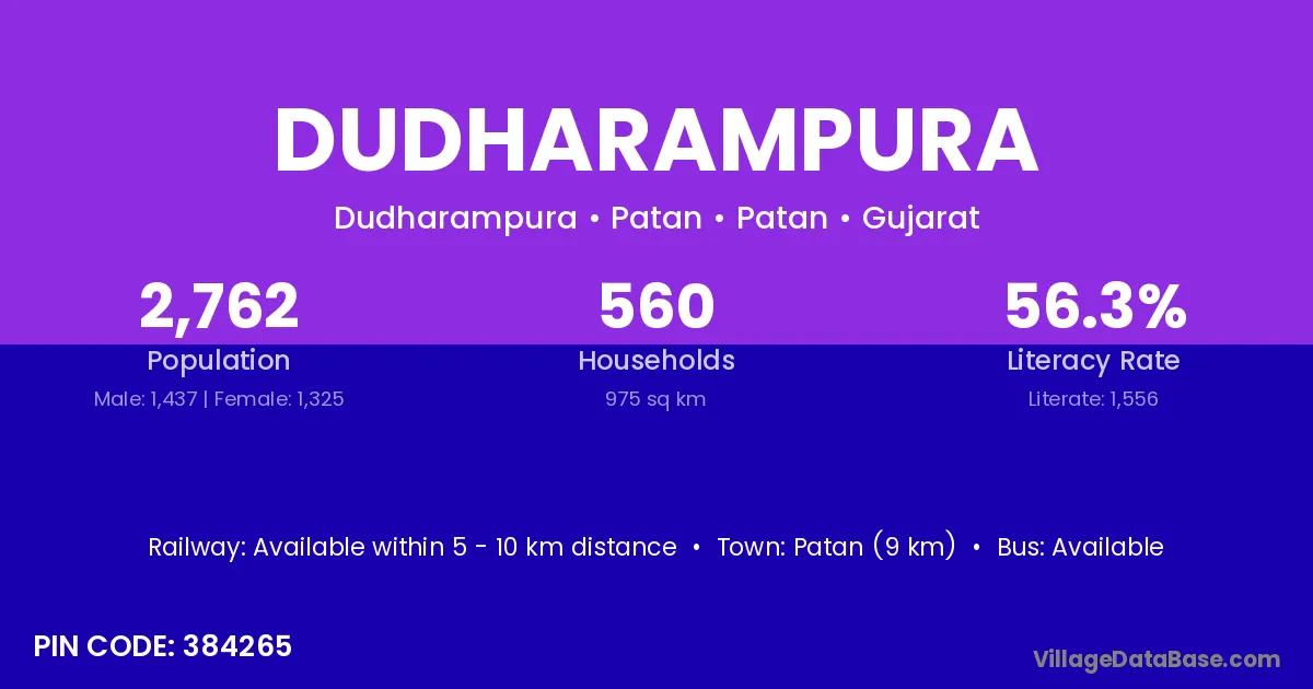 Patan (9 km) is the nearest town to Dudharampura village for major economic activities and is located approximately 9 km away.