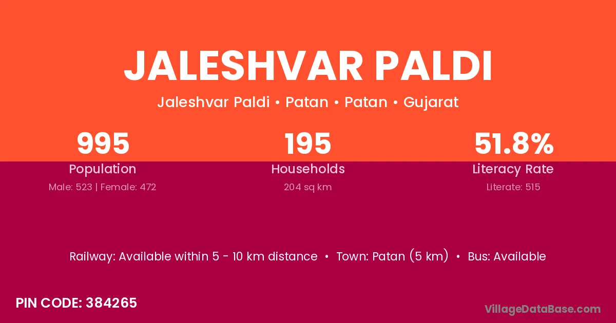 Patan (5 km) is the nearest town to Jaleshvar Paldi village for major economic activities and is located approximately 5 km away.