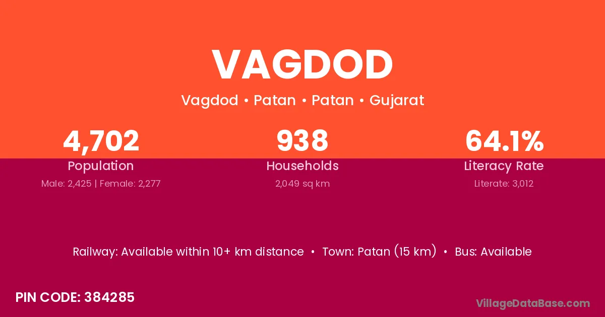 Patan (15 km) is the nearest town to Vagdod village for major economic activities and is located approximately 15 km away.