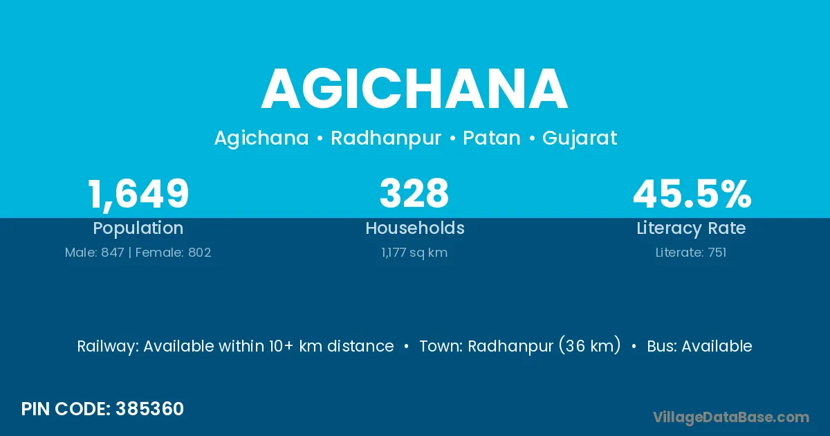 Radhanpur (36 km) is the nearest town to Agichana village for major economic activities and is located approximately 36 km away.