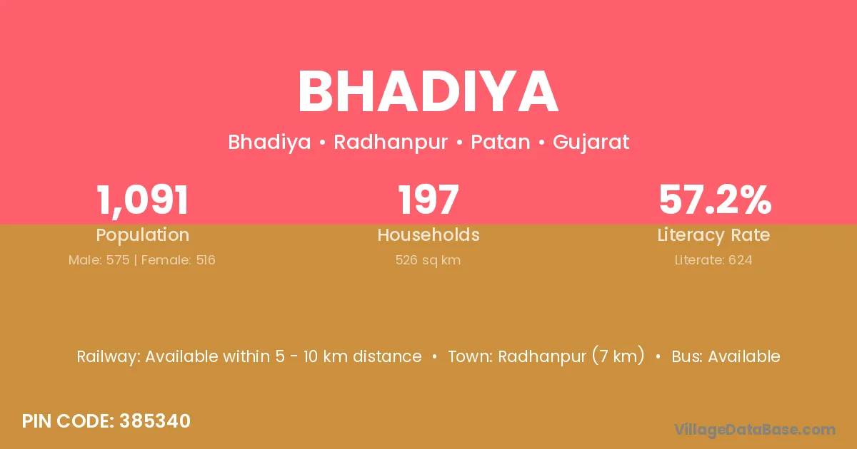 Radhanpur (7 km) is the nearest town to Bhadiya village for major economic activities and is located approximately 7 km away.