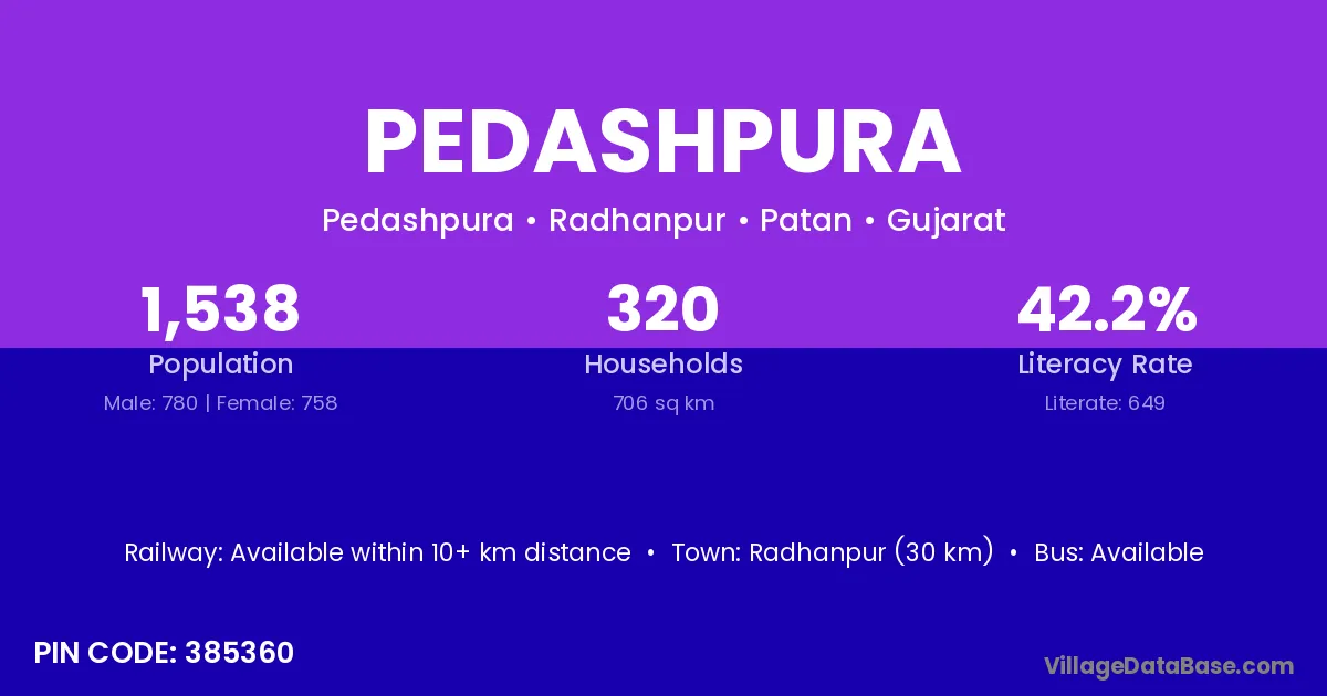 Radhanpur (30 km) is the nearest town to Pedashpura village for major economic activities and is located approximately 30 km away.
