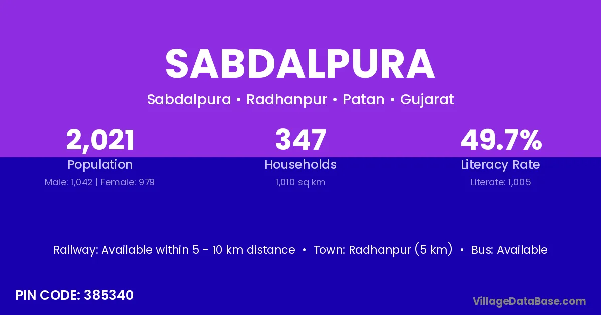 Radhanpur (5 km) is the nearest town to Sabdalpura village for major economic activities and is located approximately 5 km away.