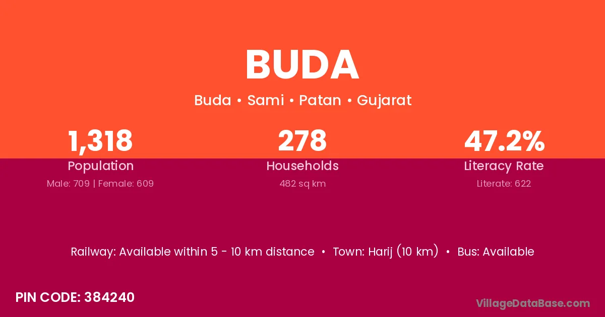 Harij (10 km) is the nearest town to Buda village for major economic activities and is located approximately 10 km away.