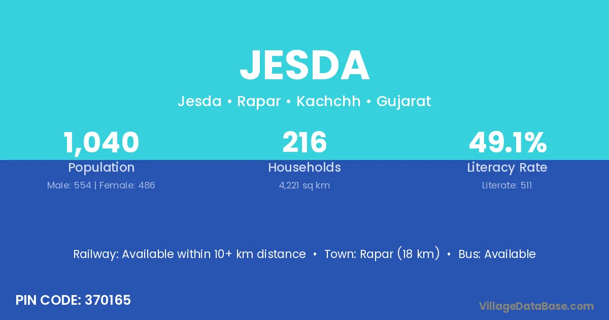 Harij (20 km) is the nearest town to Jesda village for major economic activities and is located approximately 20 km away.